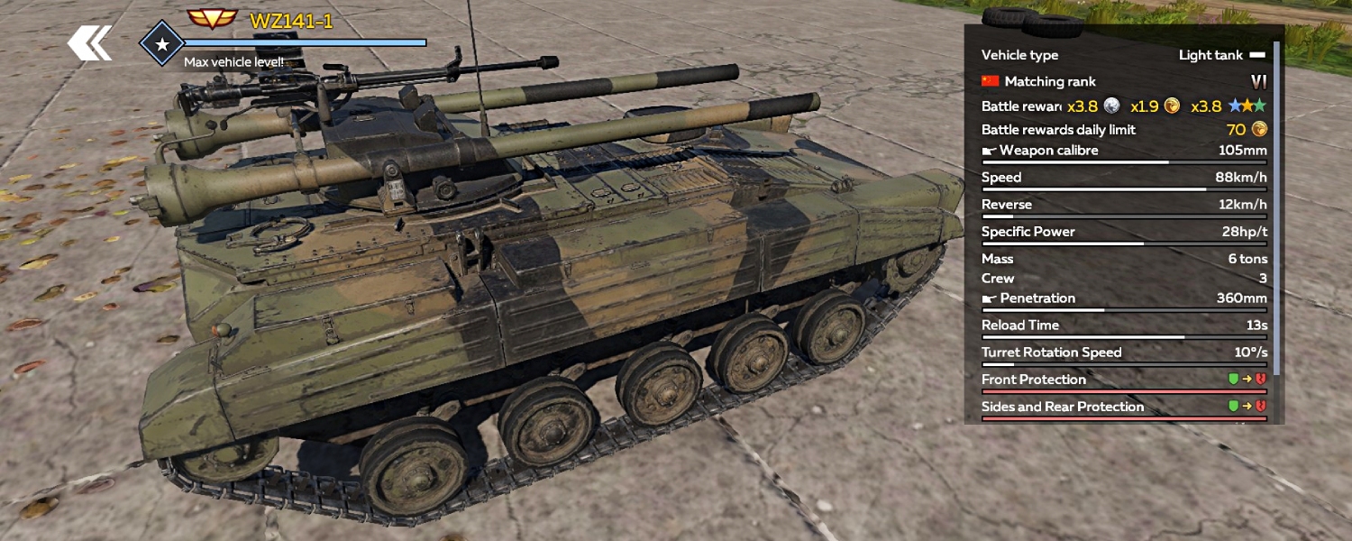 The experimental Chinese light tank WZ141-1 combines exceptional mobility with formidable firepower. Built on a lightweight, fast tracked chassis, it can easily conceal itself behind even minimal cover. At the same time, a pair of powerful roof-mounted recoilless rifles can effectively engage both lightly armored vehicles and heavily armored opponents.