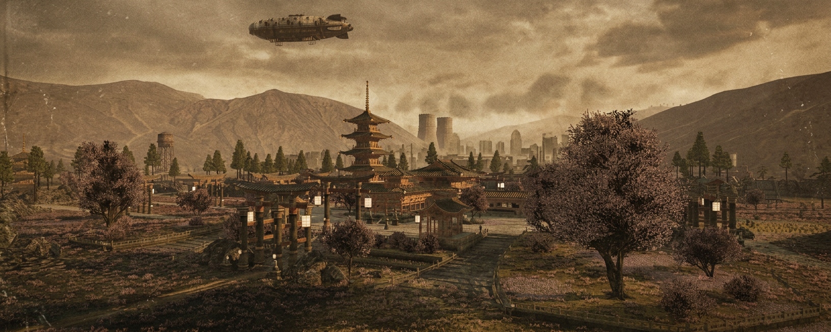 Copper Grove – a picturesque corner of traditional Japan: hills and lowlands, elegant temples, blooming cherry trees, and quaint houses. But in this timeline, the industrial revolution did not bypass the Land of the Rising Sun. Chimneys rise above the rooftops, steam curls in the air, and mechanical structures are seamlessly woven into ancient landscapes. A place where Eastern harmony meets the power of a new era.