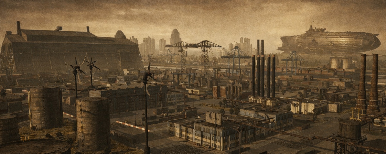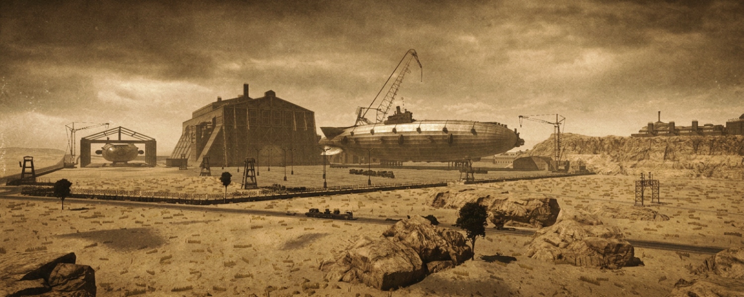 Airship Factory – once a quiet transfer town in the American desert, it transformed into an industrial giant with the arrival of the walker era. Stone factory buildings stand alongside giant hangars, smoking chimneys rise into the sky, and airships, the primary transport method of this world, drift overhead. A place where the desert freedom of the past gave way to the rhythm of assembly lines and steel.