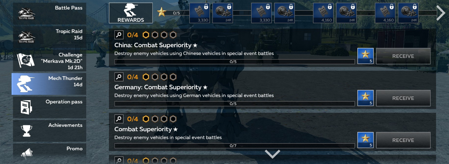 Complete the Mech Thunder event combat missions, fill the progress bar, and earn Battle Pass experience points as rewards.