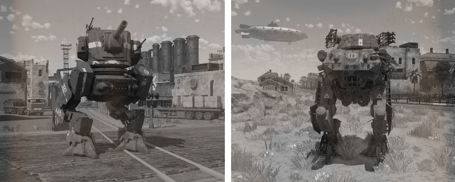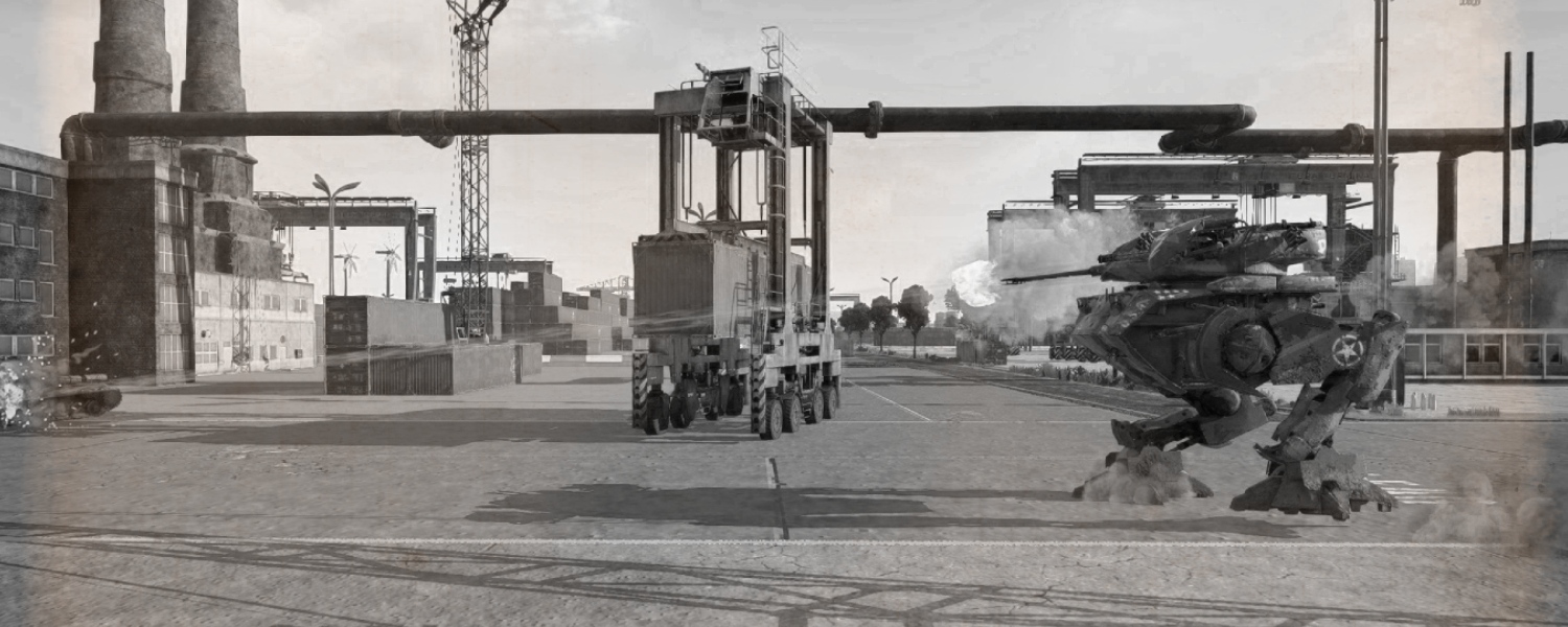 Cargo Terminal – a massive industrial zone on the shores of a bay: wide industrial chimneys, endless rows of containers, numerous hangars, and cargo cranes. In this timeline, port cities became logistics hubs for walkers, where unloading mechanical giants required massive infrastructure. Steam, steel, and the rhythm of working machinery create an atmosphere of industrial might, all focused on a single purpose.