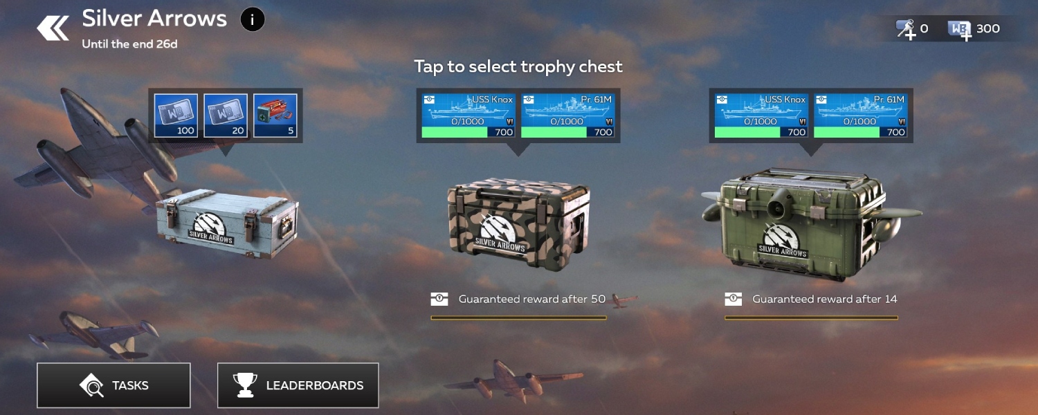 Garantierte Belohnung: 700 Blaupausen für eines der saisonalen Schiffe für 50 Versuche in der Mittleren Trophäe oder 14 Versuche in der Großen Trophäe.