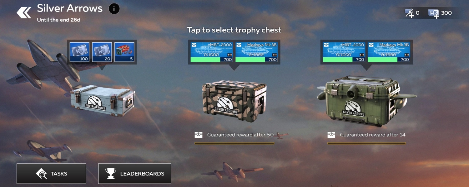 Garantierte Belohnung: 700 Blaupausen für einen der saisonalen Panzer für 50 Versuche in der mittleren Trophäe oder 14 Versuche in der großen Trophäe.