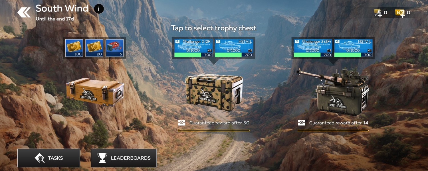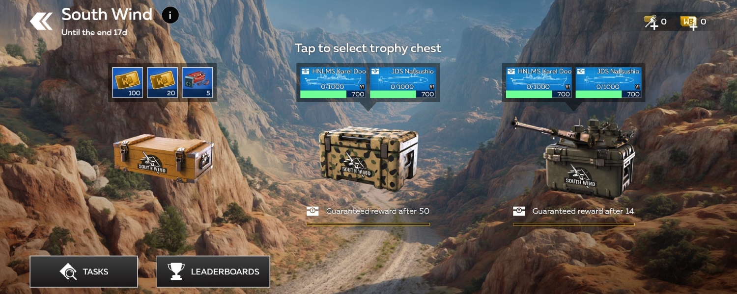 Complete the South Wind combat missions, earn War Bonds and Keys as rewards and unlock trophy containers with valuable prizes for them.