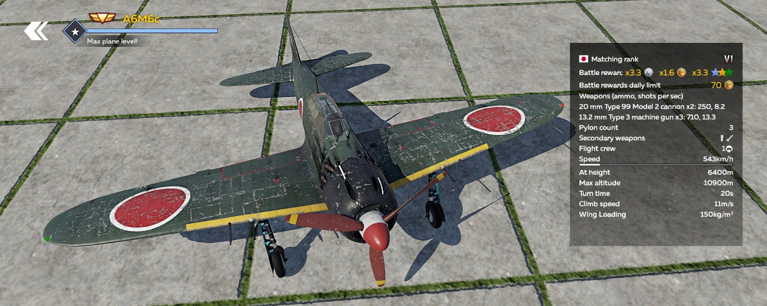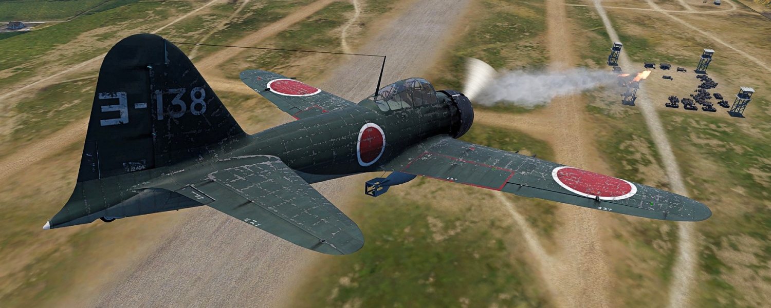Die verbesserte Bewaffnung ist ein weiterer Trumpf der späten Zero. Drei schwere Maschinengewehre, zwei 20 mm Maschinenkanonen und eine sehr große Munitionskapazität! Die A6M6c kann lange Feuerstöße abgeben, und die Masse ihres Feuers pro Sekunde reicht aus, um jeden Gegner bis hin zu schweren Bombern zu vernichten. Zusätzlich zu der vorwärts feuernden Bewaffnung gibt es auch einige Bomben und Raketen; entweder zwei 60 kg-Bomben, eine 250 kg-Bombe, zehn kleine Raketen oder ein Paar große ungelenkte Raketen!