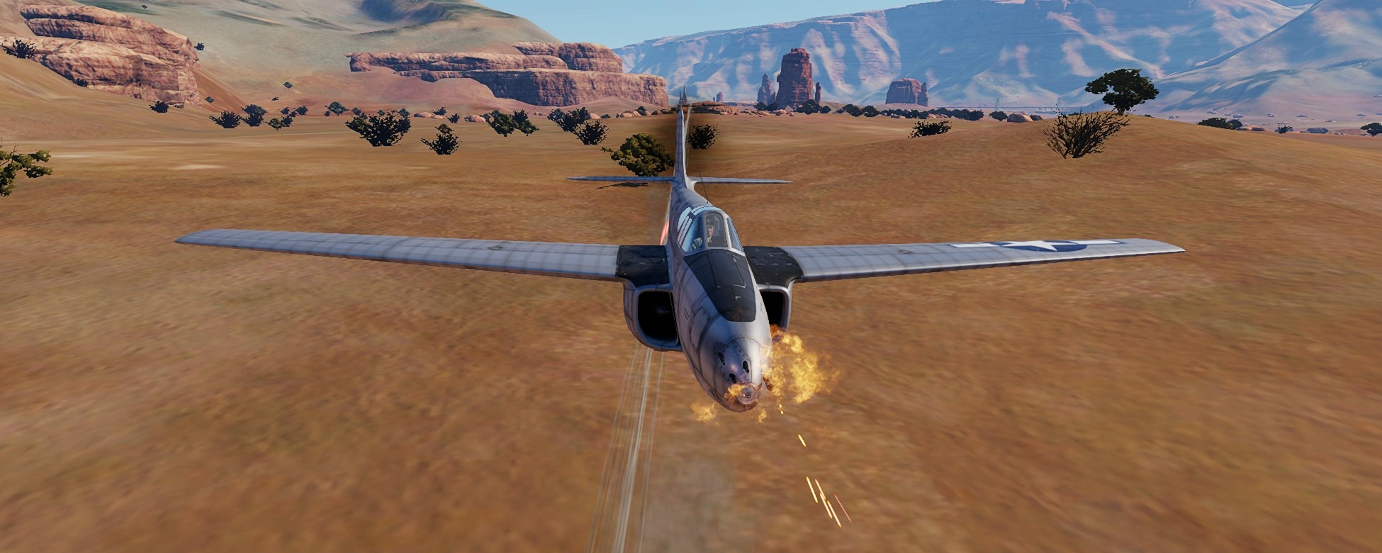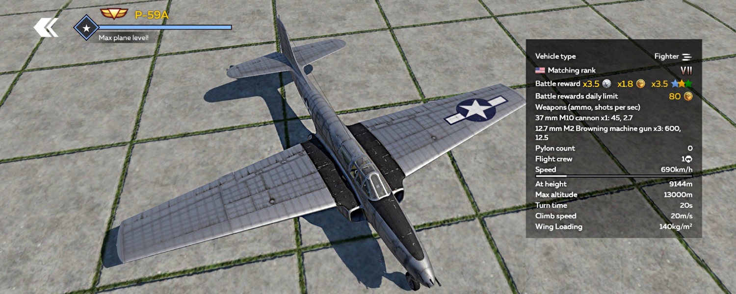 In battle, the P-59A is an obedient and predictable aircraft. The pilot must be patient to calmly gain altitude, as it will be difficult for enemies to force you down from there! Don't forget to reload the formidable 37 mm cannon in a timely manner, as its ammunition capacity is only 45 rounds.