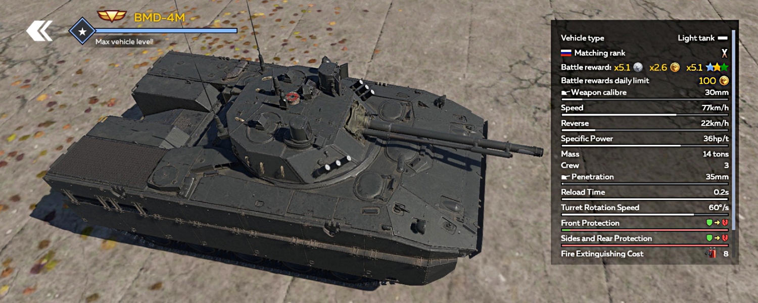 Using the BMD-4M requires skillful positioning, as the vehicle is quite noticeable. Its armor is thin, even when enhanced with a set of additional armor add-ons, meaning it cannot withstand hits from tank cannons or guided missiles.