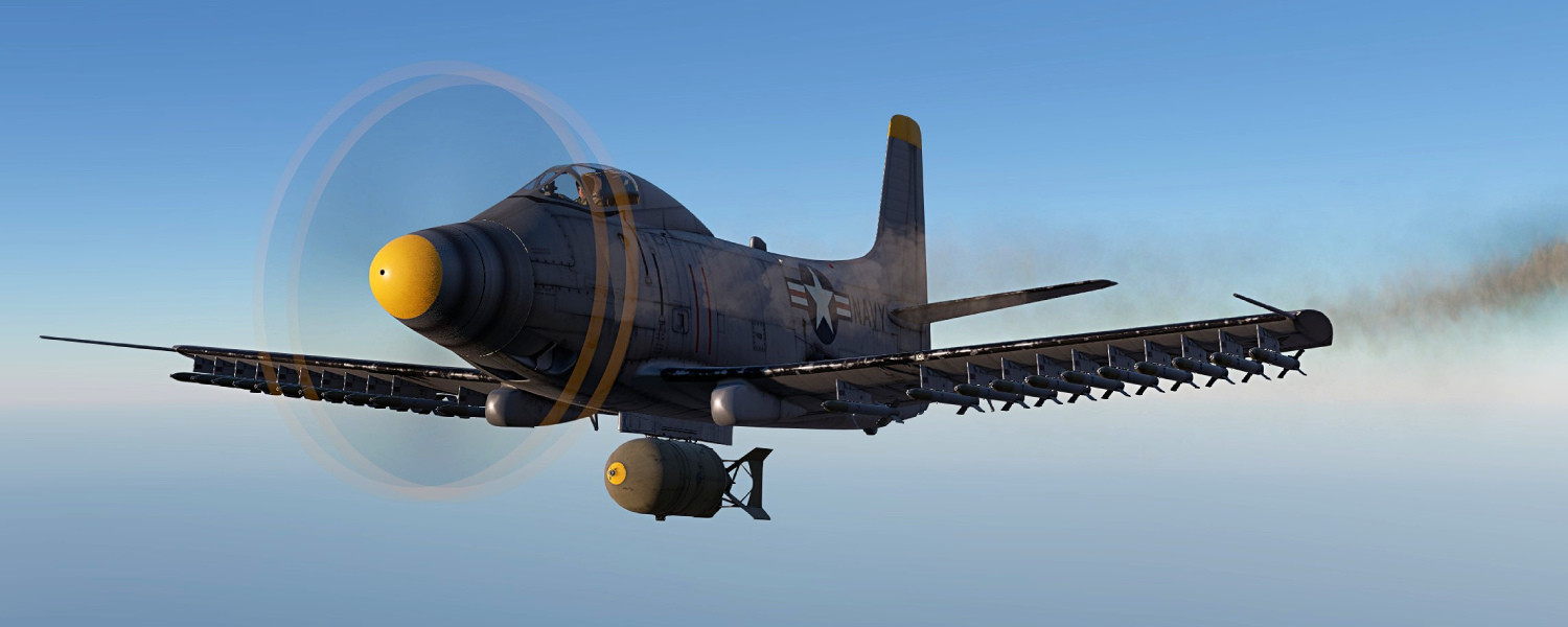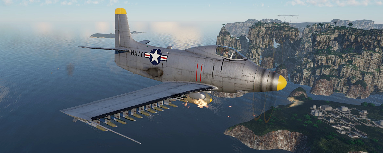 The A2D-1’s strengths also include powerful armament and an impressive bomb load. It is equipped with four 20 mm T31 cannons mounted in the wing consoles, upgraded versions of the Hispano with a higher rate of fire. This fixed forward armament is highly versatile in air combat and can effectively engage targets of any size. Under the wings, the A2D-1 carries a substantial and varied ordnance load. Across its 12 hardpoints, pilots can equip a wide range of payloads, including up to 20 HVAR rockets, torpedoes, and multiple bomb configurations: up to 20 × 250 lb bombs, 12 × 500 lb bombs, three 1,000 or 2,000 lb bombs, or a single 4,000 lb bomb. It fully embodies the US Navy carrier-based attacker philosophy: “more is more.”