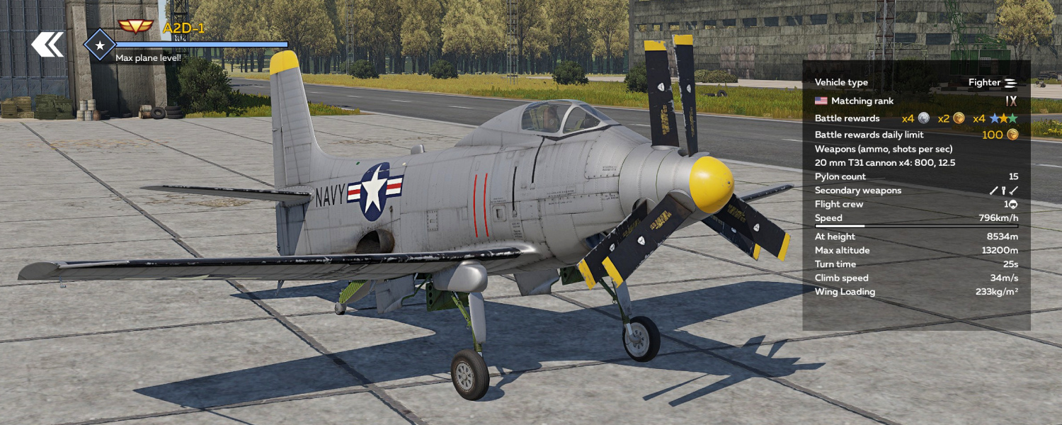 The pilot can employ the A2D-1 in several effective ways. It can engage enemy fighters at medium altitudes, operate as a “bomb truck” to destroy numerous ground targets in a single sortie, or adopt a mixed approach by striking ground targets before transitioning into air combat. The A2D-1 performs strongly in all of these roles!