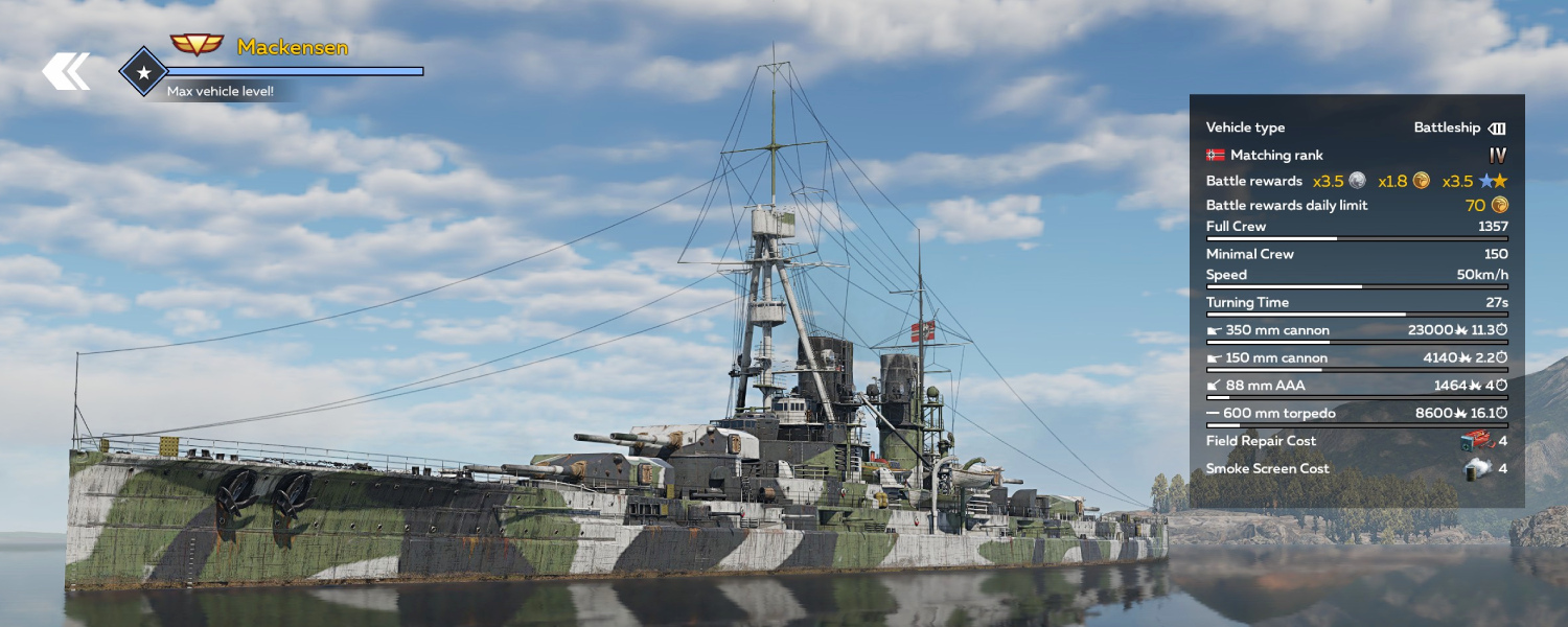 Mackensen’s combat strength centers on eight 350 mm guns mounted in four twin turrets. This main battery can reliably engage cruisers and most battleships of its rank. However, it struggles against heavily armored dreadnoughts, where its guns may prove ineffective even at short range. Its torpedo armament is a notable advantage: five submerged 600 mm tubes carrying a total of 24 torpedoes, enabling effective close-range surprise attacks. In contrast, Mackensen’s anti-aircraft defenses are limited, consisting of just eight slow-firing and outdated 88 mm guns.