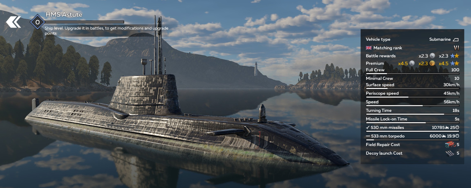 Like all nuclear submarines in the game, HMS Astute offers exceptional endurance. Unlike many of its counterparts, it is faster underwater not only than diesel-electric boats but also than many surface combatants of its rank. At periscope depth, its speed decreases, yet it retains a wide range of tactical options, from cautious long-range strikes to aggressive maneuvers in the heat of battle.