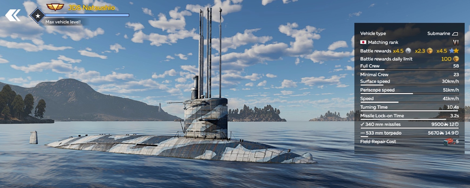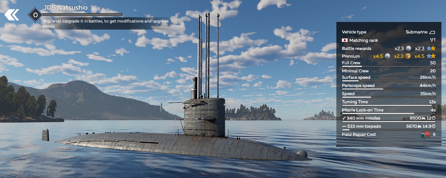 Aside from its torpedoes and anti-ship missiles, JDS Natsushio carries no additional armament. When surfacing to replenish oxygen or launch missiles, it becomes highly vulnerable to artillery and air attacks. Mastering the JDS Natsushio demands exceptional situational awareness.