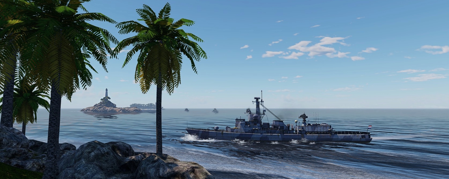 Despite its size, HNLMS Karel Doorman remains manoeuvrable enough to evade torpedoes and change course quickly in combat. It performs best when fighting from cover behind islands or rocky archipelagos. However, it requires careful handling when repositioning, as its vulnerability increases significantly during these movements. The frigate is also highly effective on the second attack line, where it can rely on allied support to mitigate aerial threats.