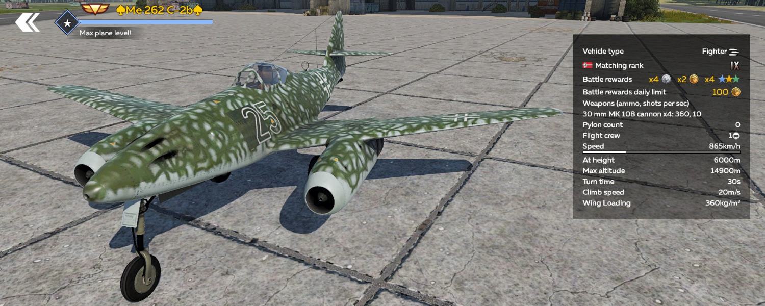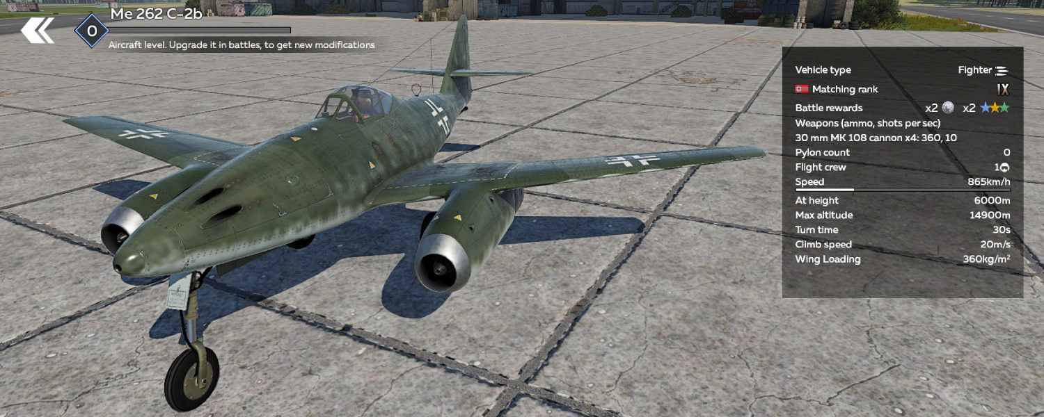 At the same time, the Me 262 C-2b retains the core strengths of the base variant – excellent top speed and a powerful armament of four 30 mm nose-mounted cannons. Even without boosters, the Schwalbe remains a highly competitive fighter at its rank, capable of engaging any opponent.