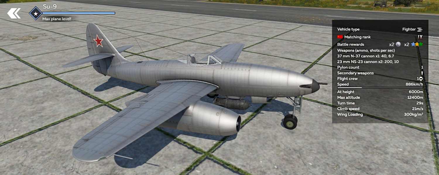 The Su-9's armament is also more powerful – a devastating 37 mm N-37 cannon complements the pair of 23 mm NS cannons. All guns have a low fire rate and a relatively small ammunition count, so it is recommended to fire in short, controlled bursts and only when you have a sure shot. When used this way, its short, powerful volleys will make short work of both enemy fighters and heavy bombers.