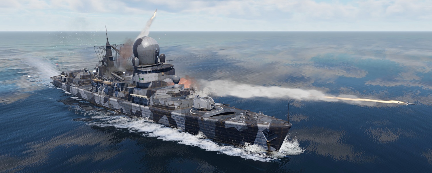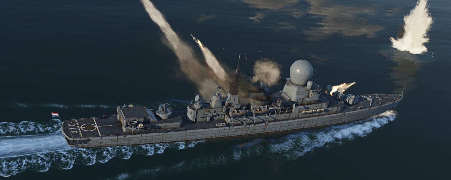 HNLMS Tromp will be the first ship in the game armed with three distinct types of missiles. Its primary striking power comes from the reliable Harpoon anti-ship missiles, known for their long range and powerful warheads. They are complemented by less destructive but high-speed Standard Mk.13 and RIM-7 Sea Sparrow surface-to-air missiles.