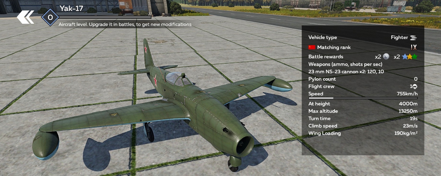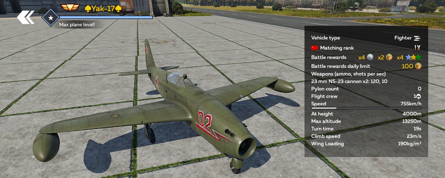 At the controls of the Yak-17, the pilot enjoys exceptional maneuverability for an early jet and can use its sustained speed to dominate piston-engine opponents. However, its main threat comes from other jet fighters of the same rank. When facing them, it’s best to lure the enemy into a turning engagement, where their superior speed becomes far less effective.