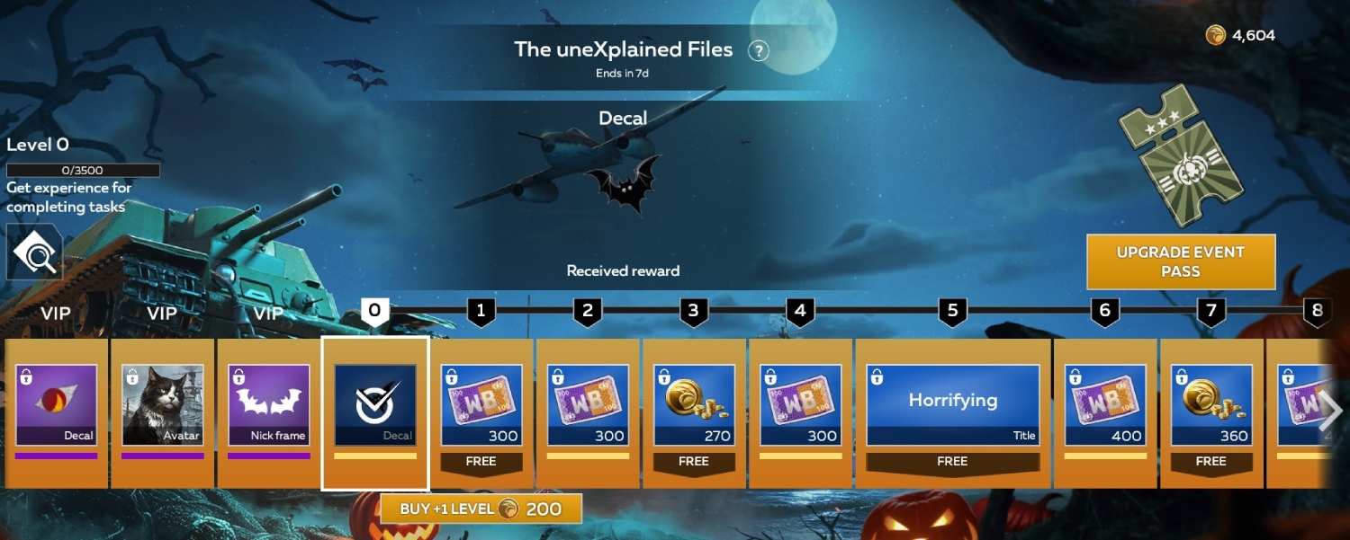 The VIP Pass instantly unlocks the stylish nickframe decorator “Bats,” the charming avatar “Witch’s Cat,” and the mystical all-vehicle decal “Reflection of the Night.” It also automatically completes all 7 steps of the Event Pass.