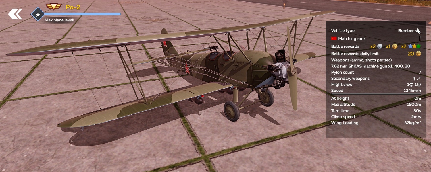 The Soviet Po-2 (U-2) biplane, developed in 1927 under the direction of N.N. Polikarpov, was originally designed to train future pilots in aeroclubs. Although it is the slowest biplane in the game and lacks forward-firing armament or armor, it offers exceptional maneuverability, carries a 7.62 mm ShKAS machine gun, and can be equipped with bombs.