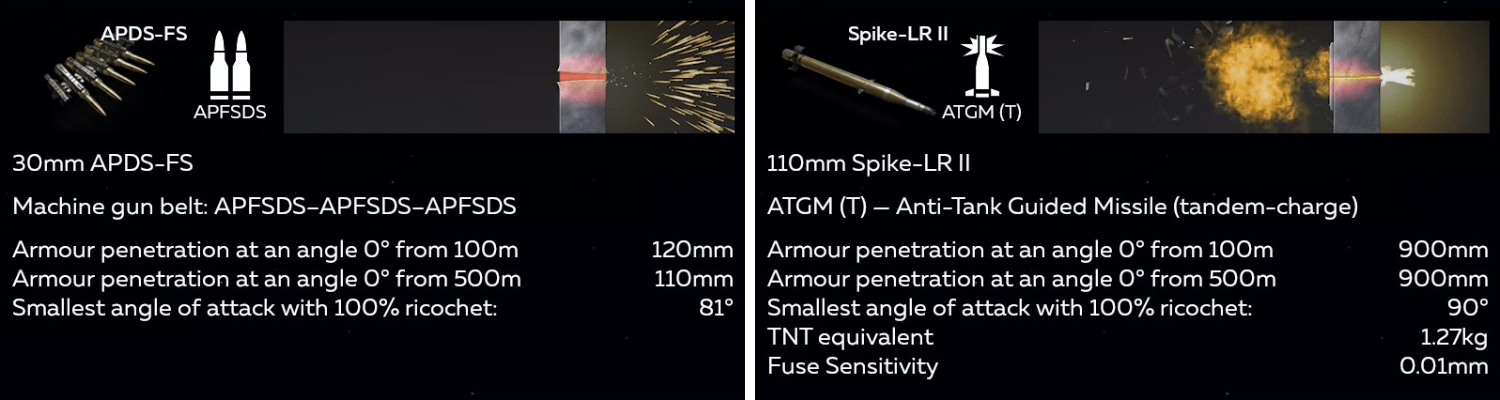 The already agile CV90 chassis in this modification received a reinforced engine and a refined transmission. Even its increased weight doesn't prevent the CV 90 Mk IV from racing across the battlefield at speeds of nearly 80 km/h and handling rough terrain with ease. Its main armament is a 30 mm Bushmaster with belts for light and armoured targets. With it, you can even hunt main battle tanks by hitting their sides. The real highlight of this modification is the tandem-warhead Spike-LR II ATGMs with automatic target tracking and a total of 6 missiles!