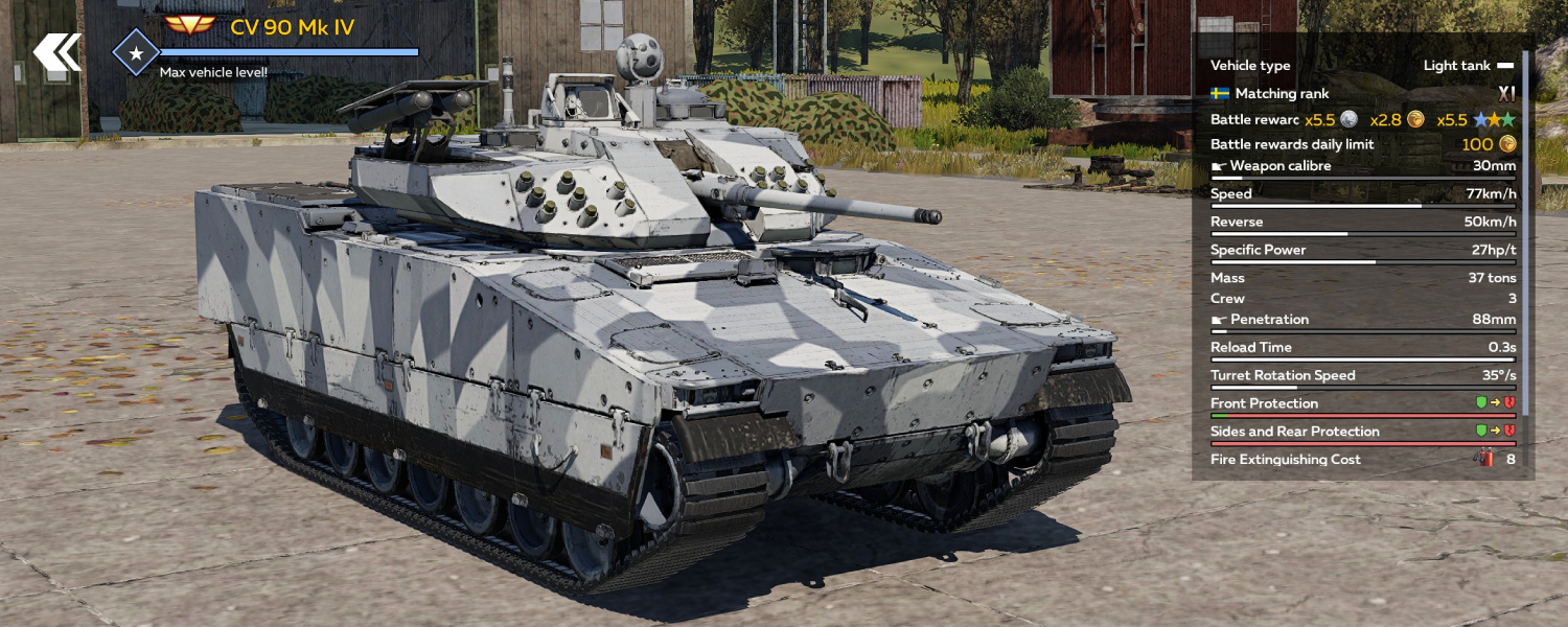In battle, the CV 90 Mk IV can take on the roles of an active capture point attacker, a tank hunter, or a support vehicle for allied tanks. High mobility and excellent firepower guarantee success with any tactic! However, an IFV is still an IFV – the CV90's armour cannot withstand tank cannon shells. So strike first and strike true!
