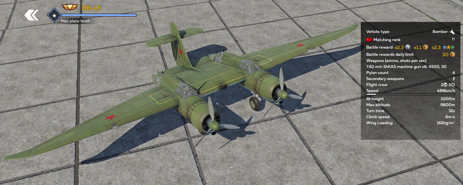 For its class and rank, the DB-LK has average speed. It can easily escape most biplanes, but monoplane fighters on your tail will cause problems. All of the aircraft's defensive armament consists of rifle-calibre ShKAS machine guns. Therefore, to reliably take down pursuers, you'll have to let them get to close range and keep in mind the limited firing arcs of the turrets.