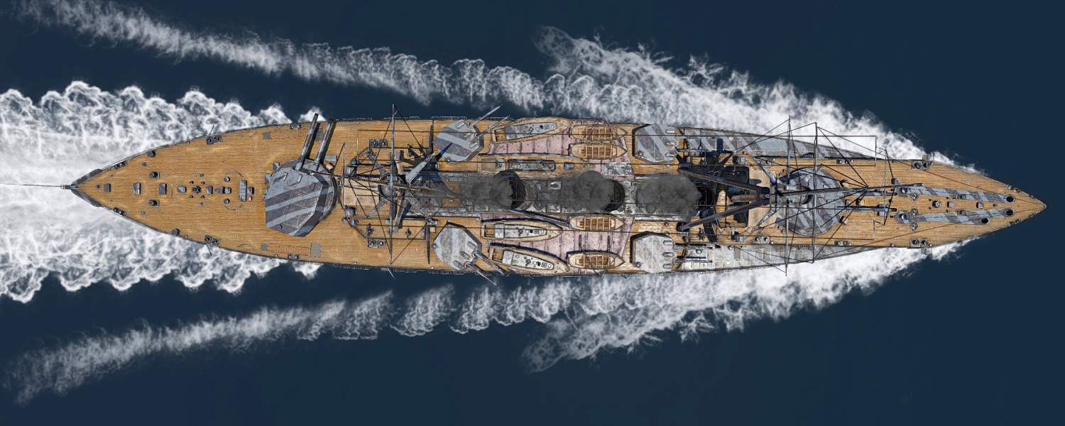 The battlecruiser IJN Kurama features interesting armament. The main battery consists of four 305 mm guns in two turrets. There are two secondary calibers – eight 203 mm guns in twin turrets and 120 mm guns on the gun deck (seven per side). With a good angle to the enemy, you can fire shells of three different calibers in a single broadside! The IJN Kurama's additional armament consists of 450 mm wet-heater torpedoes.
