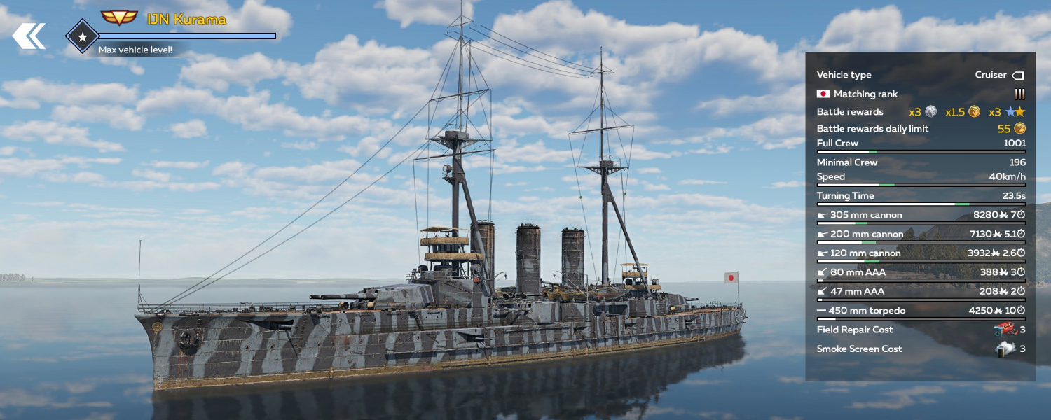Rank III of the Japanese tree is getting the battlecruiser IJN Kurama – a very interesting early ship that relies on high firepower and quite acceptable protection for its class. It will be not only an effective hunter of cruisers and other small ships, but also, if necessary, can hold its own in battle against dreadnoughts. So, a brief introduction.