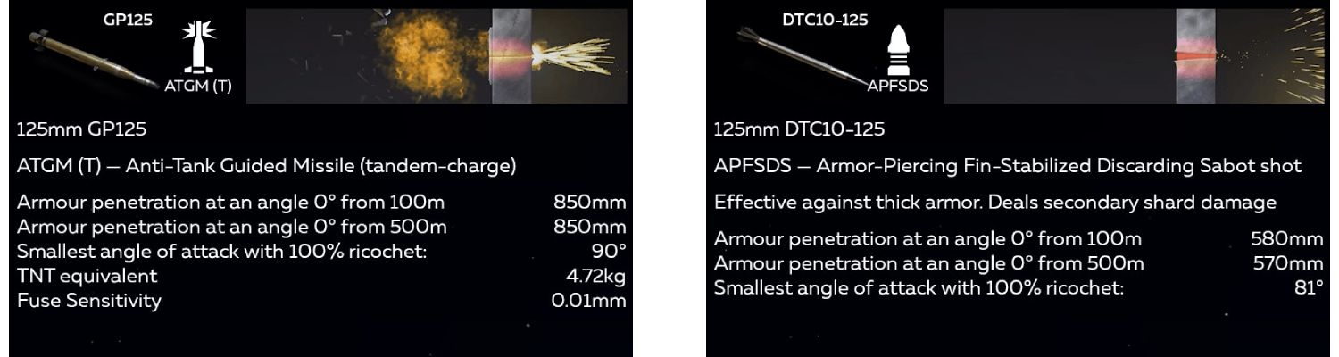 Die im Inland hergestellte 125-mm-Kanone wird von einem großen 22-Schuss-Karussell-Autolader gespeist, der eine Nachladezeit von 6,7 Sekunden ermöglicht. Die Granatenvielfalt ist beeindruckend: eine HEATFS-Granate, zwei Arten von HE-Granaten (mit Kontakt- und Annäherungszünder), zwei Arten von APFSDS mit einer Durchschlagskraft von bis zu 577 mm und sogar eine Tandem-Ladungs-ATGM! APFSDS ist eure primäre Panzerabwehrmunition, aber das Mitführen anderer Granatenarten ist für unkonventionelle Situationen sehr empfehlenswert, z. B. für den Einsatz gegen leicht gepanzerte Ziele, Gegner hinter Deckungen oder sich unvorhersehbar bewegende Fahrzeuge.